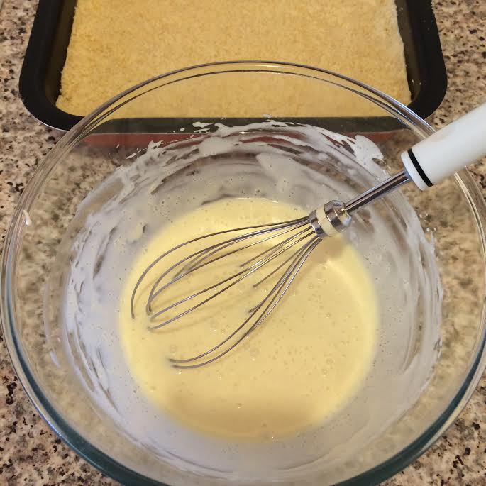 В миске смешать венчиком: сметану, яйцо, сахар, ванильный сахар и муку.