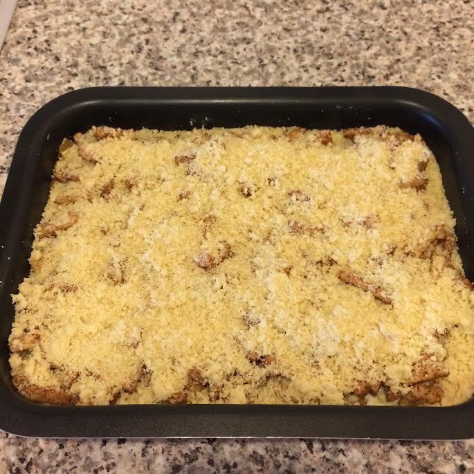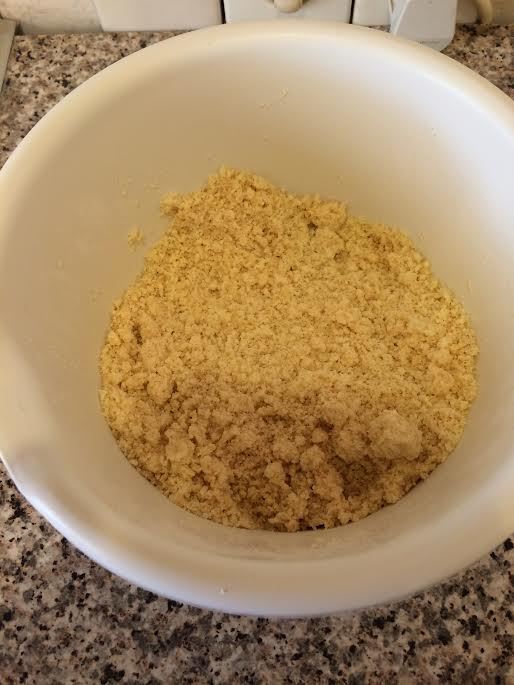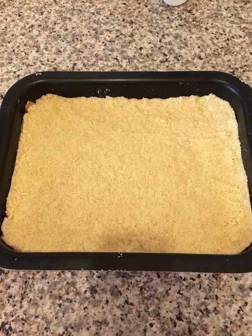 Духовку нагреть до 180°С. Форму 20х20 застелить бумагой для выпечки. В миске смешать муку, соль, разрыхлитель, соду и растопленное сливочное масло. Должна получиться крошка.