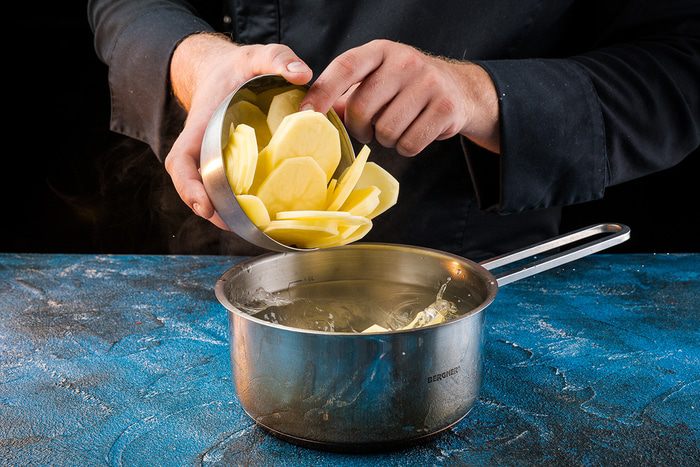 Картофель нарезать тонкими кружочками, примерно 0,5 см, промыть водой и отварить до полуготовности в подсоленной воде.