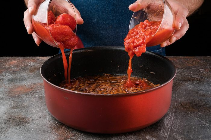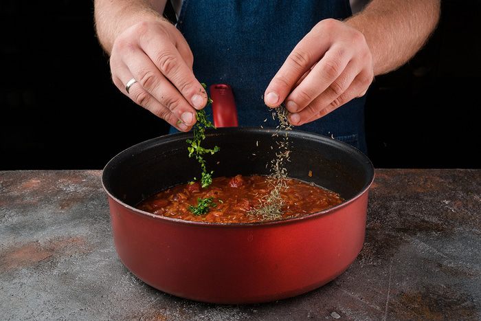 Положить ложку сахара и специи. Посолить и поперчить. Накрыть сковороду крышкой и потушить соус на медленном огне 20 — 25 минут.