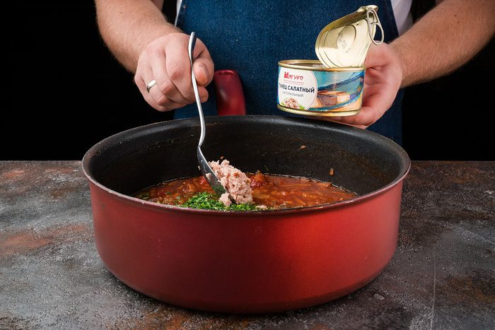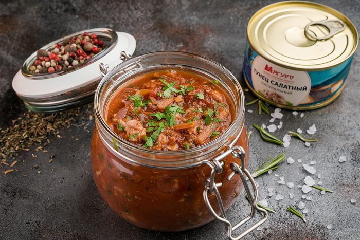 Через указанное время добавить в томатный соус кусочки тунца из банки и нарезанную зелень петрушки. Потушить все вместе еще минут 5 и снять с огня.