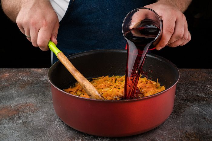 Мелко нарезать лук и морковь натереть на крупной терке. Все переложить в сковороду, предварительно полив ее оливковым маслом.Также добавить измельченный чеснок. Добавить вино.