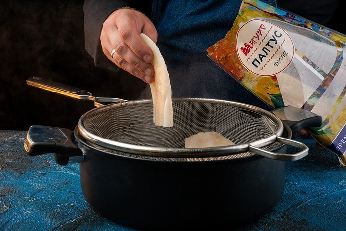 Филе палтуса «Магуро» немного посолить и поставить готовиться на пару на 20 — 25 минут.