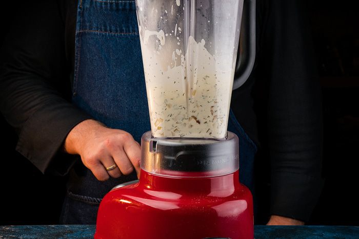 Снять с огня. Вынуть бадьян, веточки укропа, лавровый лист. Отложить несколько целых грибов для украшения. Остальную массу пюрировать в блендере до однородности.