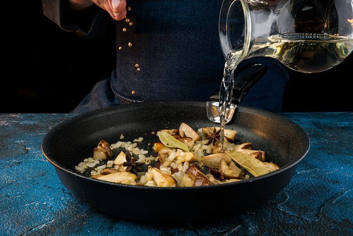 Тем временем приготовить соус. Грибы обжарить на растительном масле 5 минут. Добавить мелко нарезанный лук, специи, веточки укропа, вино. Тушить 10 минут, вино выпарится наполовину.