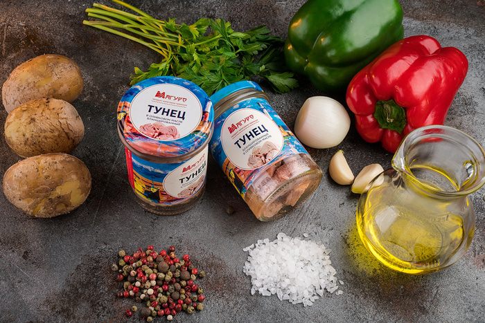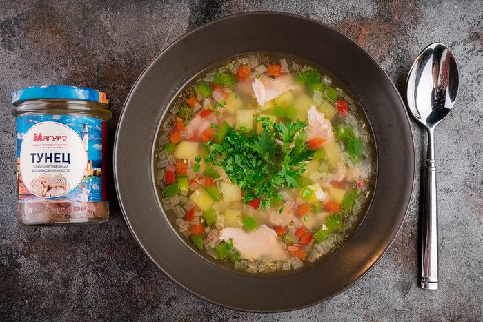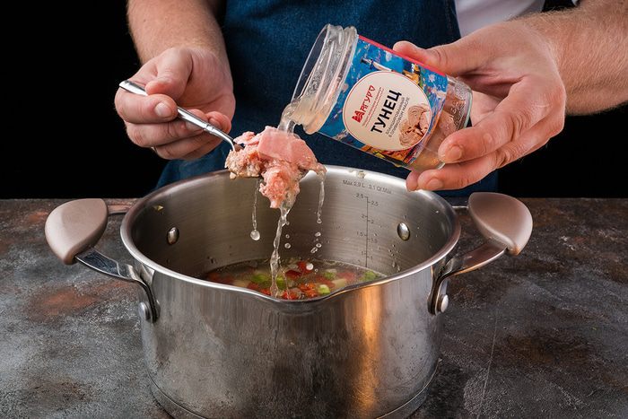 Влейте в кастрюлю 1,5 л горячей воды, доведите до кипения, добавьте тунца, приправьте солью и перцем, варите 10 минут.