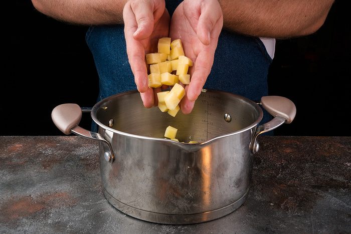 Очистите картофель, порежьте кубиками и добавьте в кастрюлю, обжарьте 5 минут.