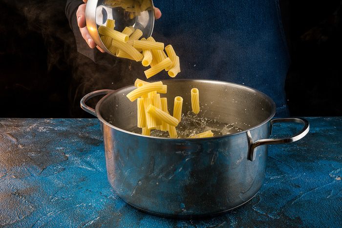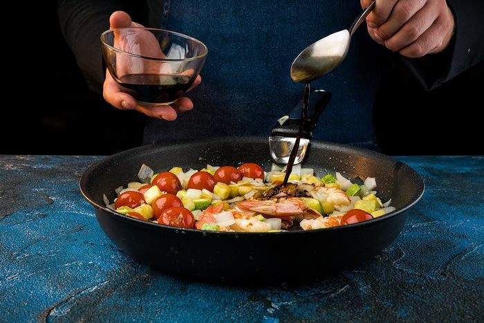 Влить в содержимое сковороды соевый соус, поперчить, прогреть 1 мин. На тарелку выложить пасту, сверху — соус со сковороды.