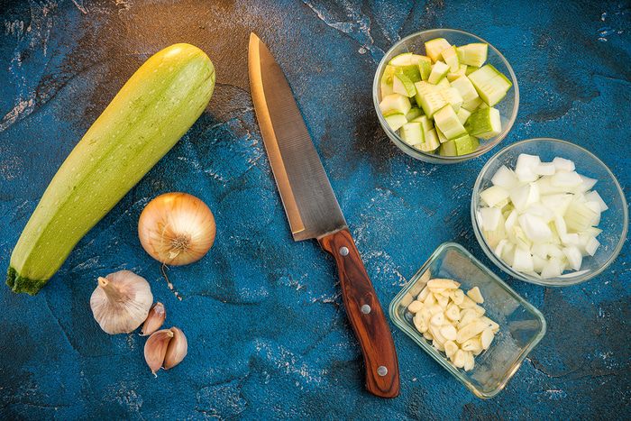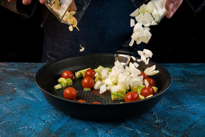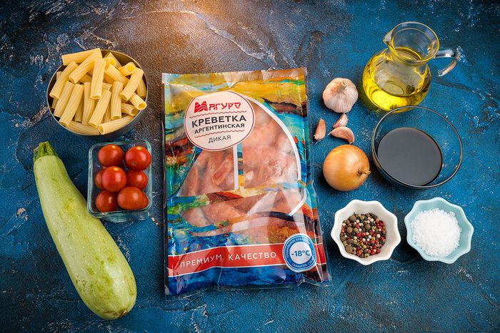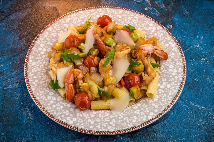 На сковороде разогреть оливковое масло. Обжарить кабачки и помидоры черри. Затем добавить в сковороду лук, чеснок, креветки, жарить 4 мин., пока креветки не изменят цвет.