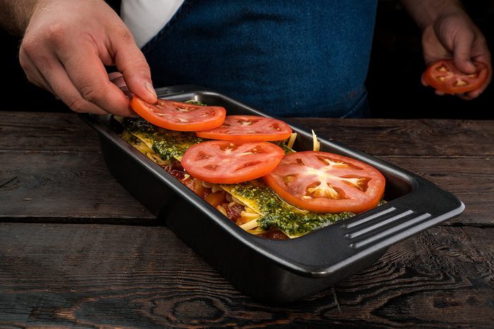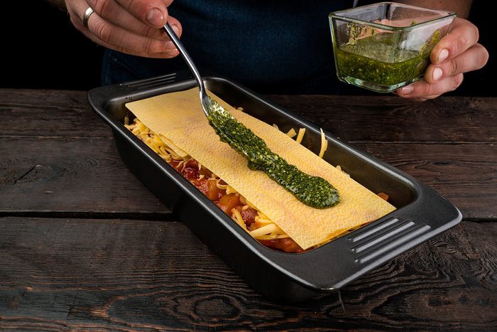 Накрыть листом теста, снова положить баклажаны и лечо «Помидорка». Сверху смазать соусом песто.