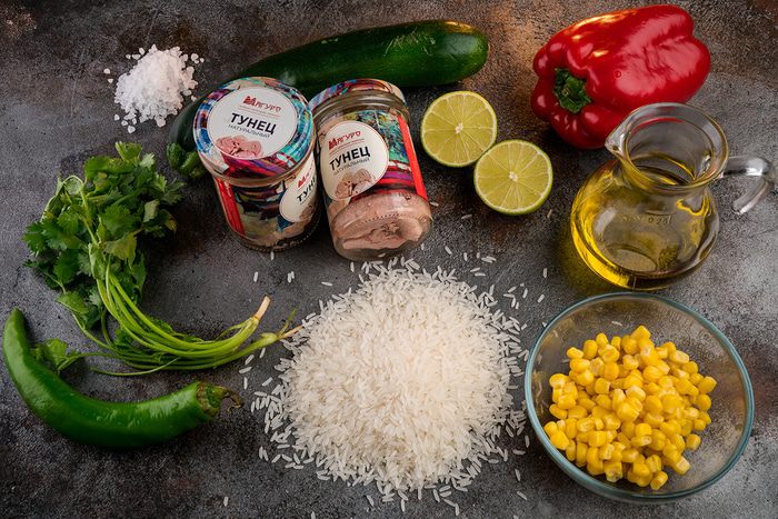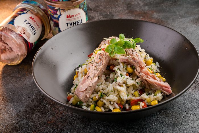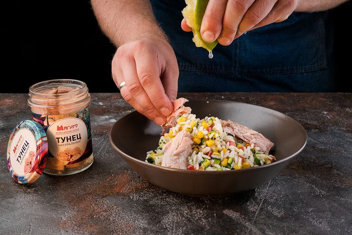 Переложить рис с овощами в тарелку, сверху разложить кусочки тунца. Из половинки лайма выжать сок и полить рис с овощами.