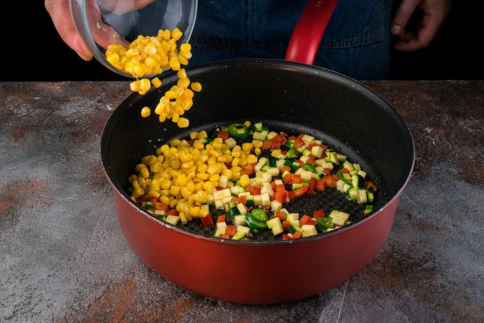 Разогреть в сковороде 2 ст. ложки оливкового масла и обжарить перец. Цукини, нарезанный кубиками перец чили и кукурузу и выложить к перцу.