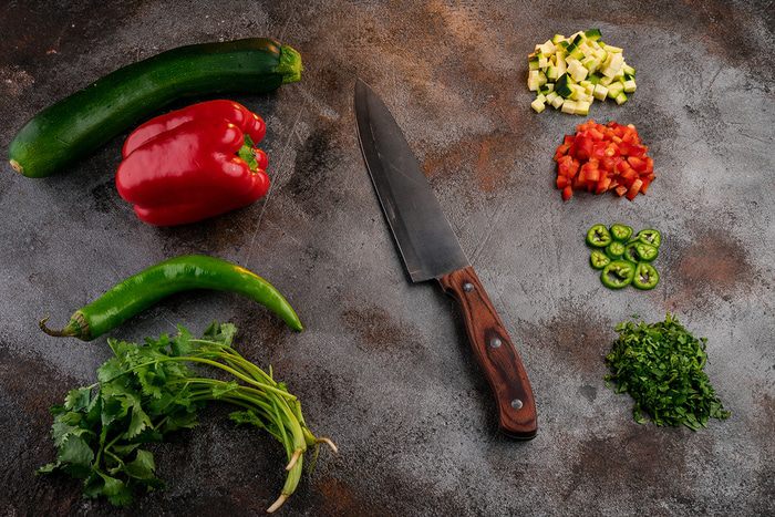 Сладкий перец, удалив плодоножку с семенами, нарезать маленькими кубиками.
