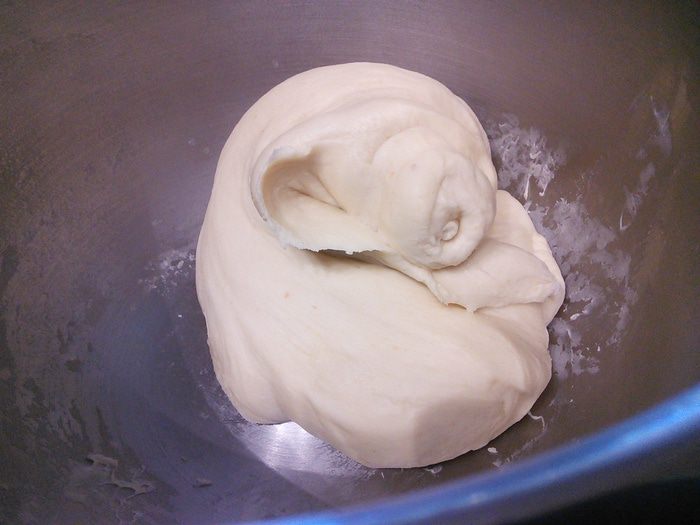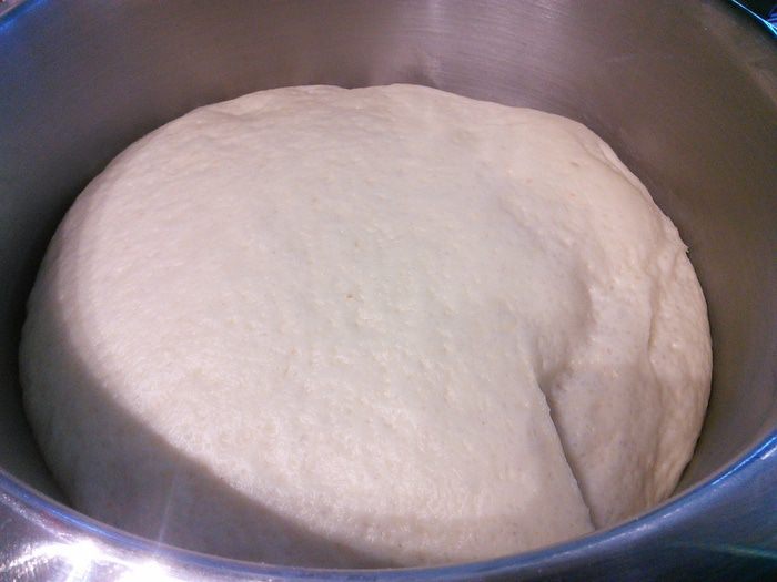 Влить дрожжевое молоко и замесить гладкое, эластичное тесто. Накрыть пищевой пленкой и поставить в теплую духовку на расстойку на 1 час.