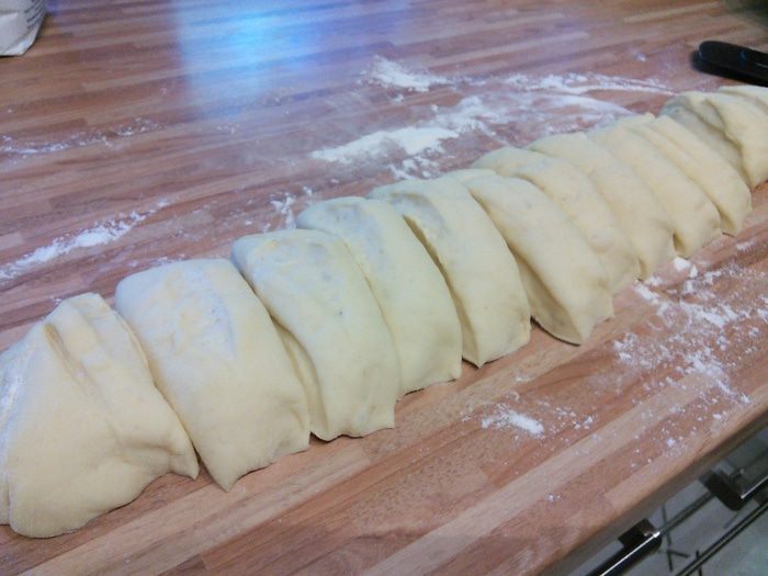 На посыпанной мукой поверхности делим тесто на 12 кусочков.