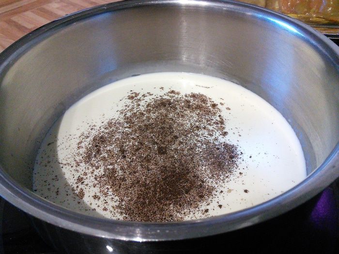 Готовим пудинг. Он должен успеть остыть. Пудинг можно приготовить заранее. В кастрюле нагреть сливки и половину молока с сахаром и щепоткой соли. Можно использовать ванильный сахар, а также семена ванили от половинки стручка. Вторую половину отложите в сторону, ваниль нам понадобится для приготовления штройзеля.