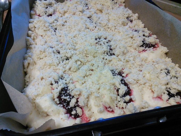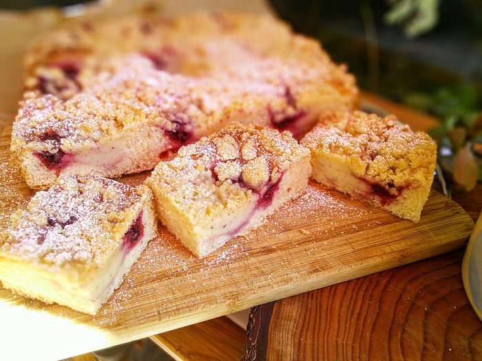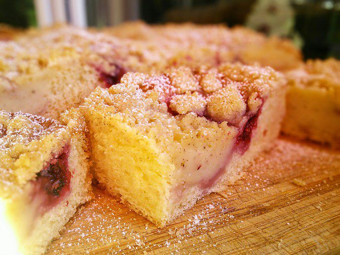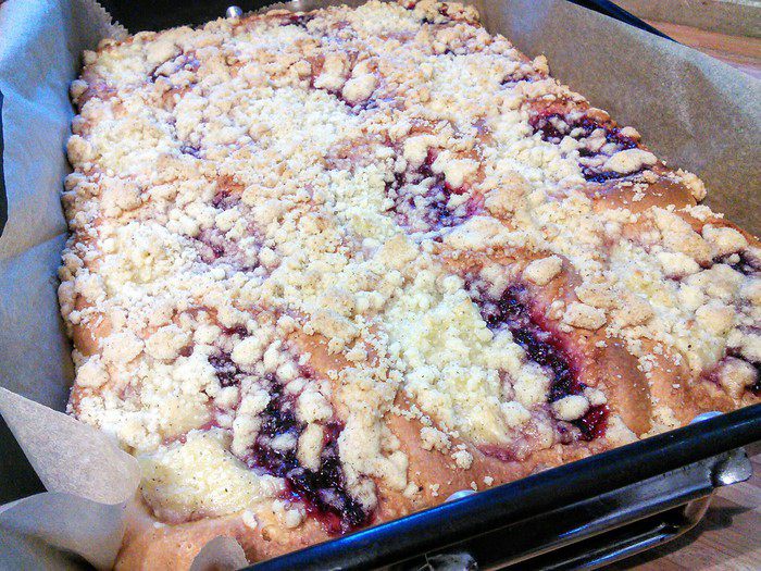Клубничные бухтельн (сдобные булочки) с ванильным пудингом и штрейзелем