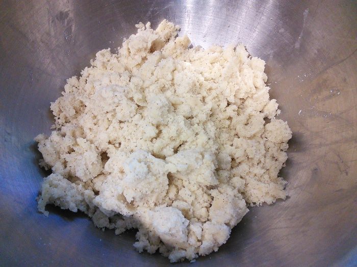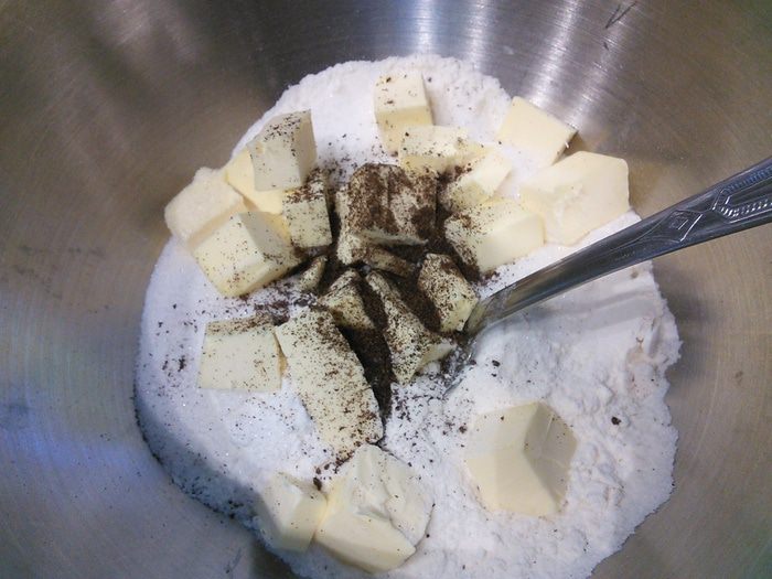 Для штрейзеля смешать в миске муку, сахар, щепотку соли и холодное масло, нарезанное мелким кубиком. Добавить ванильные зернышки. Очень удобно готовить штрейзель в блендере, я в этот раз делала штрейзель руками. Просто перетрите всю смесь в крошку.