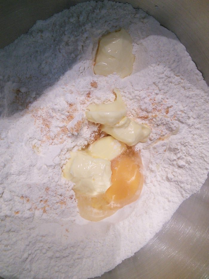 В теплом молоке растворить дрожжи с 1 ст. л. сахара из общего его количества, отставить в сторону. В чашу комбайна просеять муку, добавить остальной сахар, щепотку соли, яйцо и размягченное сливочное масло.