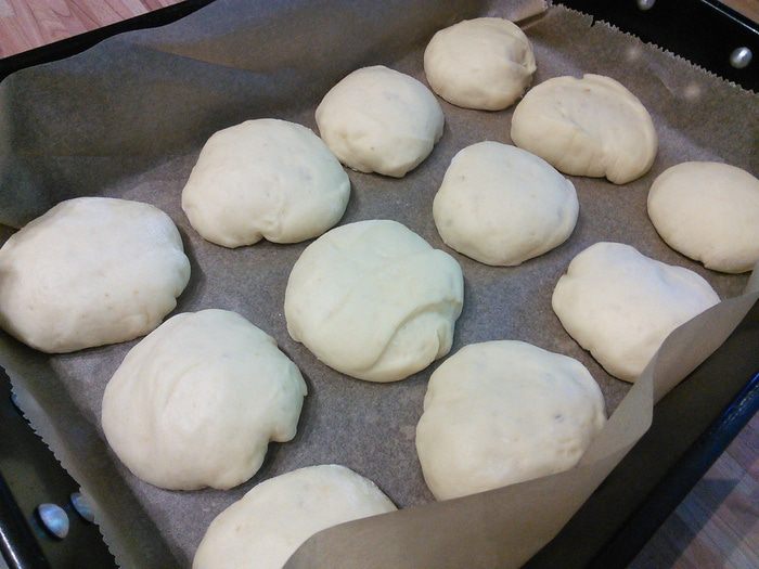 Подошедшие булочки выглядят примерно так. Духовку разогреть до 180°С.