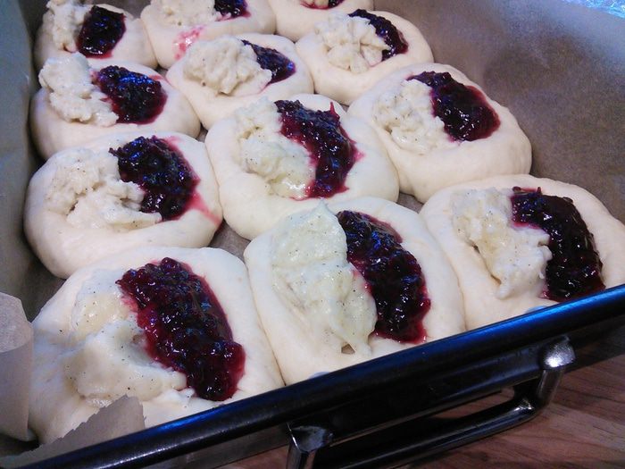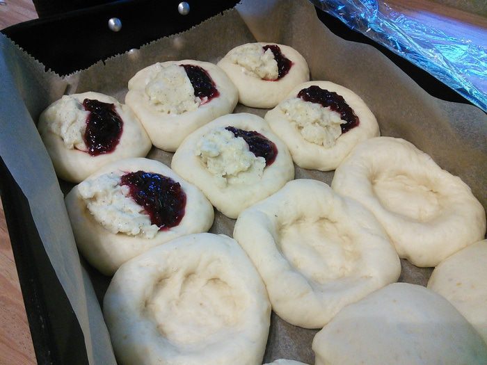 В каждой булочке сделать углубление и наполнить пудингом и вареньем: на 1 булочку по 1 ст. л. пудинга и 1 ч. л. варенья. Еще раз поставить в теплое место на под пленкой на 20 — 30 мин.
