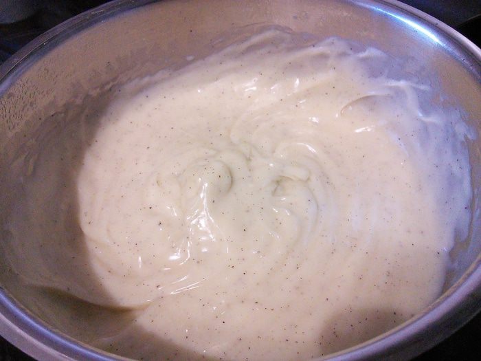 В горячие сливки тонкой струйкой ввести крахмальную смесь и активно помешивая венчиком заварить густой пудинг. Это происходит в течении 1 минуты. Накрыть пленкой и охладить.
