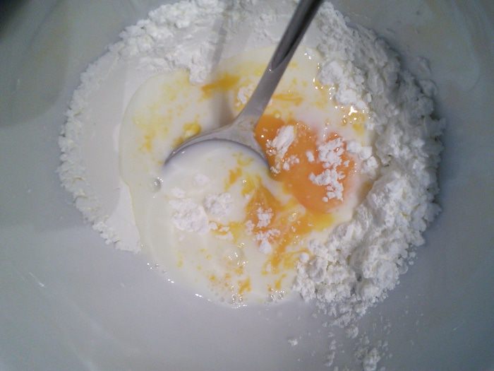 В отдельной емкости соединить крахмал с желтком и оставшимся молоком, размешать, чтобы не было комочков.