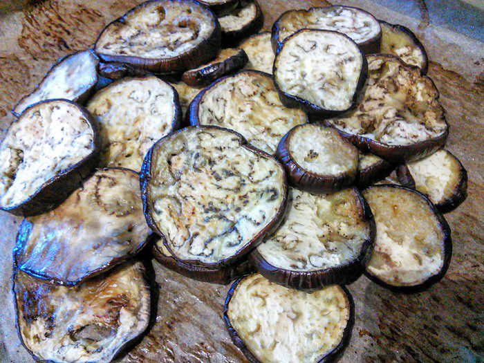 Баклажаны вымыть, нарезать кружочками. Посыпать солью, оставить на время. Затем промокнуть влагу, выложить на противень, сбрызнуть оливковым маслом и запекать в течение 40 мин. или до готовности в разогретой до 180°С духовке. В середине времени каждый кружочек перевернуть.