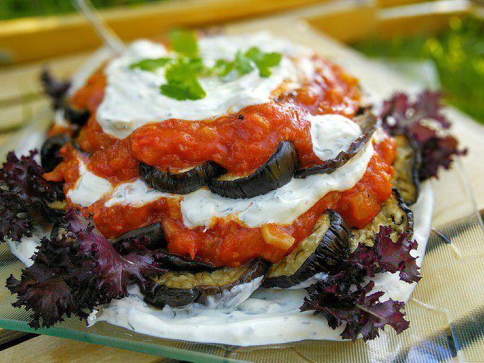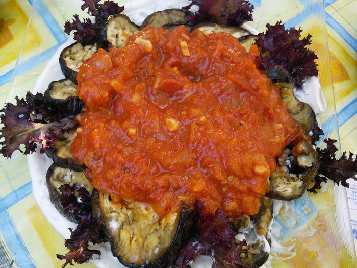 На большое блюдо выложить слоями: сметанный соус, баклажаны, суго.