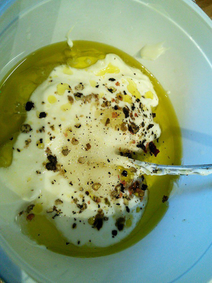 Для сметанного соуса соединить сметану с йогуртом (можно полностью заменить сметану йогуртом) с оливковым маслом, соком лимона, солью, перцем (я добавила чесночную кашицу) и мелко рубленной зеленью.