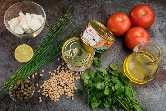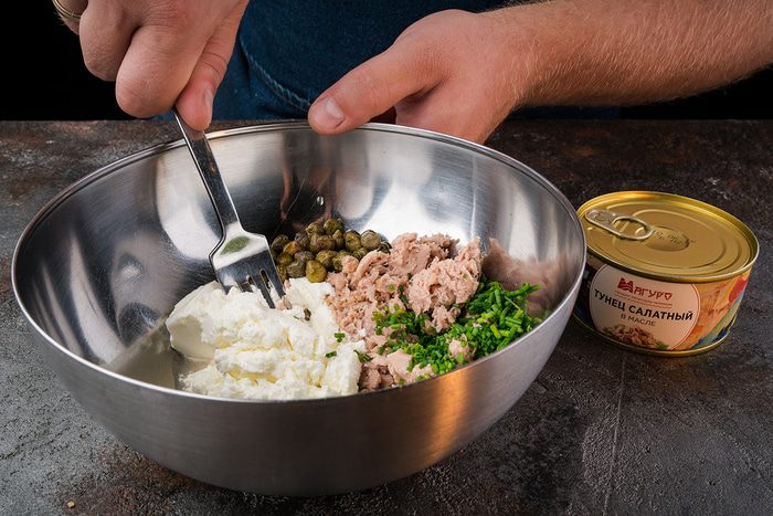Нарезать шнитт-лук и сыр фета. Приготовить начинку: к тунцу добавить сыр, шнитт-лук, каперсы и все еще раз размять вилкой.