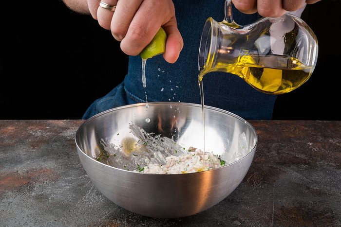 Полить начинку соком лайма, оливковым маслом и все перемешать.