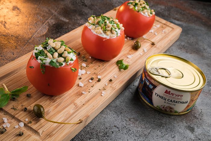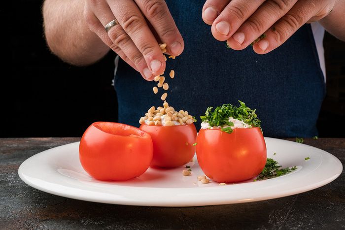 Наполнить помидоры начинкой, посыпать кедровыми орехами, кинзой.