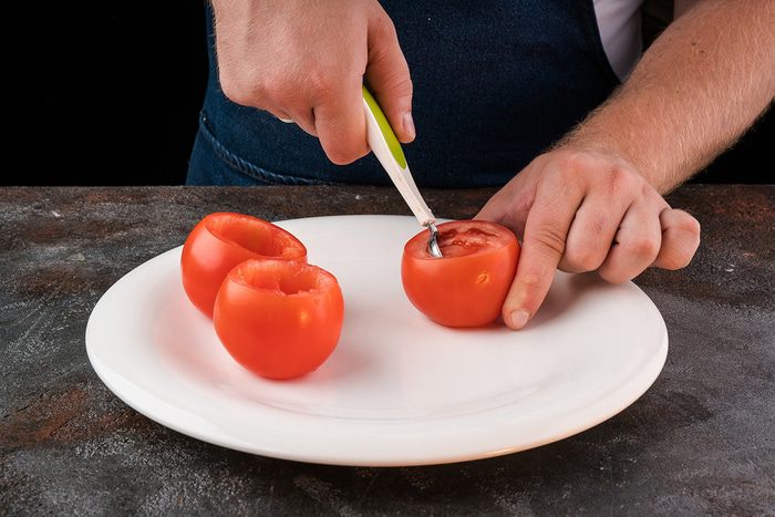 С помидоров срезать крышечку и удалить сердцевину вместе с семенами и соком. Кинзу мелко порубить.