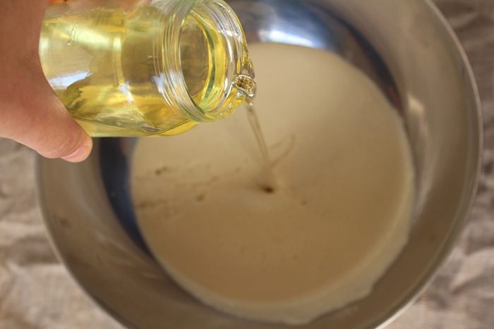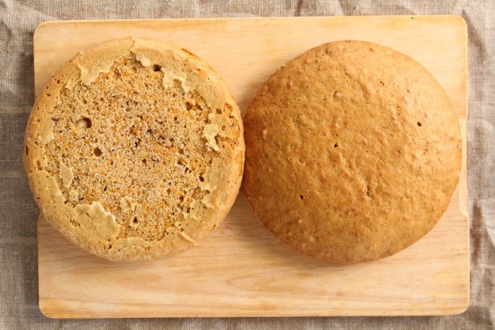 Совет: смазываем форму сливочным маслом (тонким слоем), бросаете немного муки и трясем. Вся форма изнутри покроется мучной пылью. Излишки вытряхните. Этот прием называют «французская рубашка» — коржи сами выходят из формы после выпекания.