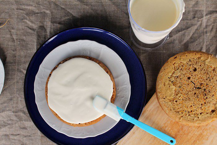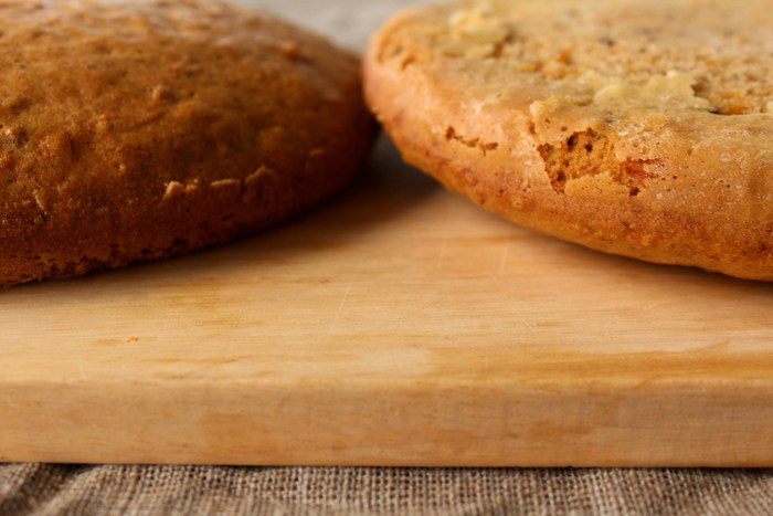 Духовка наша должна быть разогрета до 180°С. Если вы будете выпекать одним коржом, время выпекания будет от 40 минут. Определяем готовность просто — сухая зубочистка и румяная корочка.