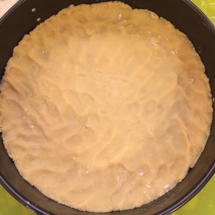 Духовку нагреть до 180°С. Форму (26 см) выстлать бумагой для выпечки. Большую часть теста распределить по форме.