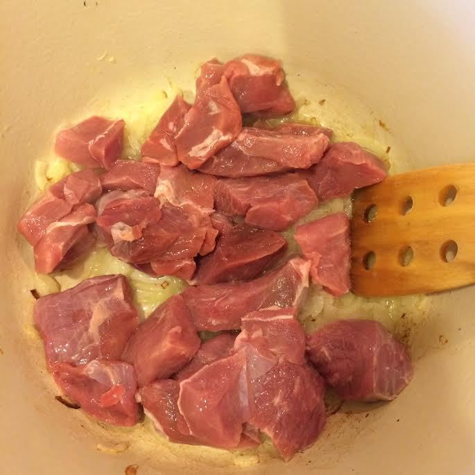 В кастрюле с толстым дном потушить лук до золотистого цвета. Затем добавить мясо и обжарить.