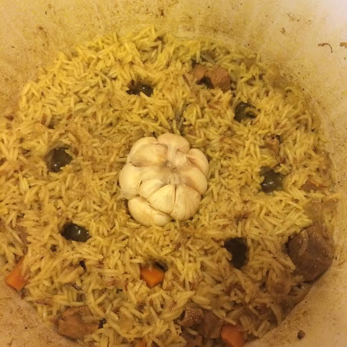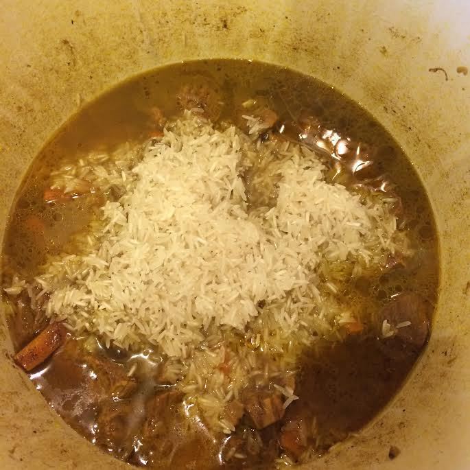 Рис выложить на мясо, посолить, не перемешивать, залить горячей водой (вода должна покрыть рис), накрыть крышкой и варить 10 минут, за это время рис впитает почти всю воду.