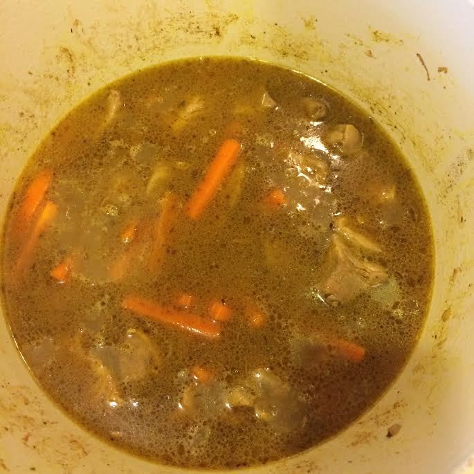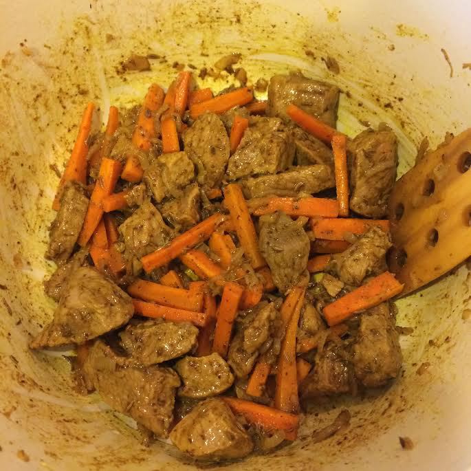 Залить водой, вода должна покрыть мясо, накрыть крышкой и тушить на медленном огне 40 — 50 минут.