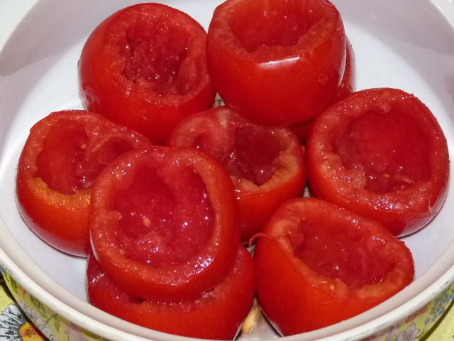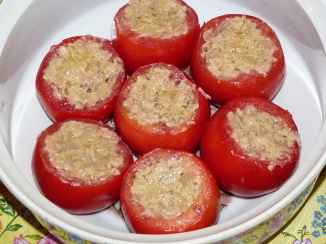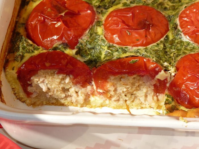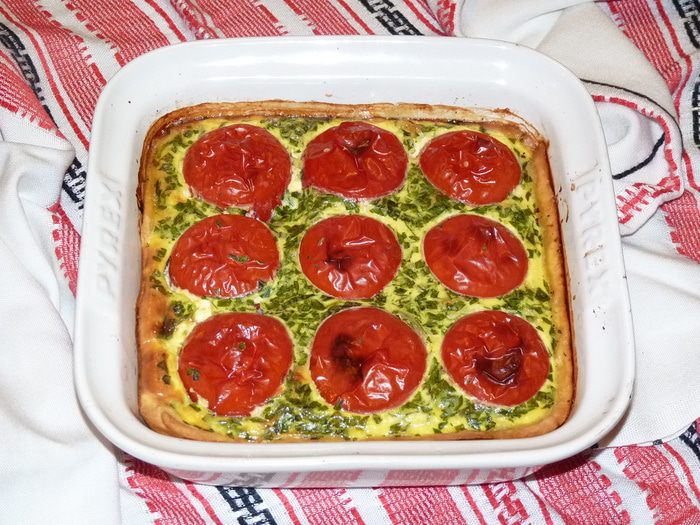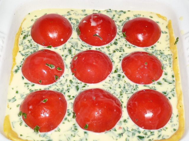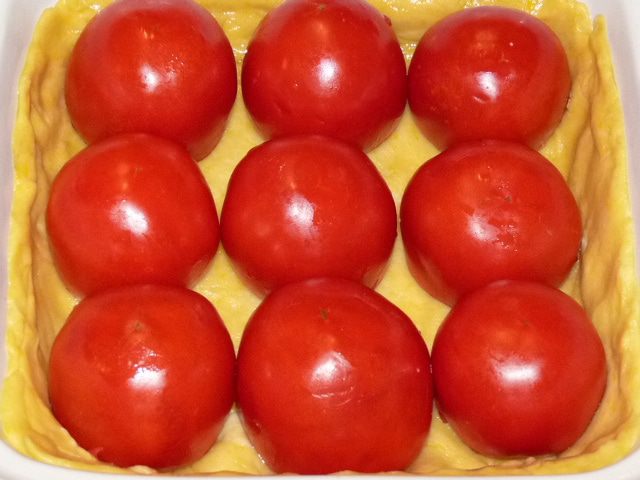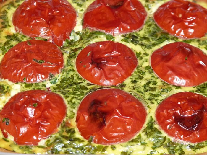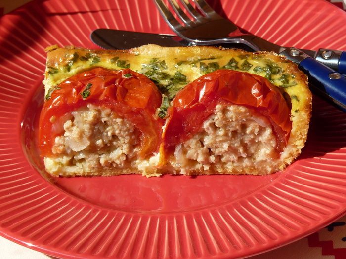 Открытый заливной пирог с фаршированными помидорами. Листая на даче старые кулинарные журналы, наткнулась на очень интересный, на мой взгляд, рецепт. Предлагаю и вам попробовать. Блюдо получилось яркое и красивое, «нарядное», можно сказать! Кроме того, еще и очень вкусное! Подойдет и для праздничного застолья, и просто на ужин в кругу семьи. Такой пирог, только в большой прямоугольной форме, делала друзьям на новоселье (форму ведь пустую не дарят), гости и хозяева были в восторге, а это лучшая оценка. Делюсь с вами. Угощайтесь!