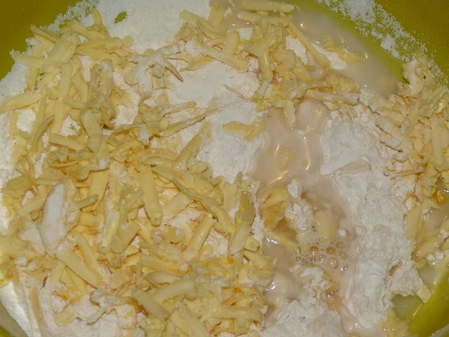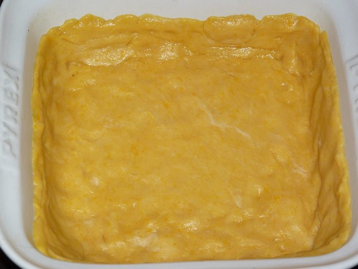 Тем временем натереть на терке сливочное масло (оставить немного для смазывания формы). Замесить тесто из муки, масла, щепотки соли, 1 желтка и 3 стол. ложек воды (может понадобиться чуть больше муки).