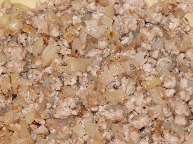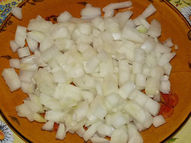 Лук нарезать кубиками и обжарить на растительном масле до прозрачности.