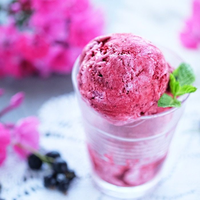 Данное количество ингредиентов рассчитано на мороженицу с чашей 500 мл и выход готового мороженого около 1 кг. Мороженое готовится в два этапа: сначала делается черносмородиновый сорбет, затем сливочное мороженое, оба вида смешиваются и получается окончательный вариант. Заранее нужно подготовить мороженицу (заморозить чашу согласно инструкции) и контейнеры для заморозки готового мороженого.