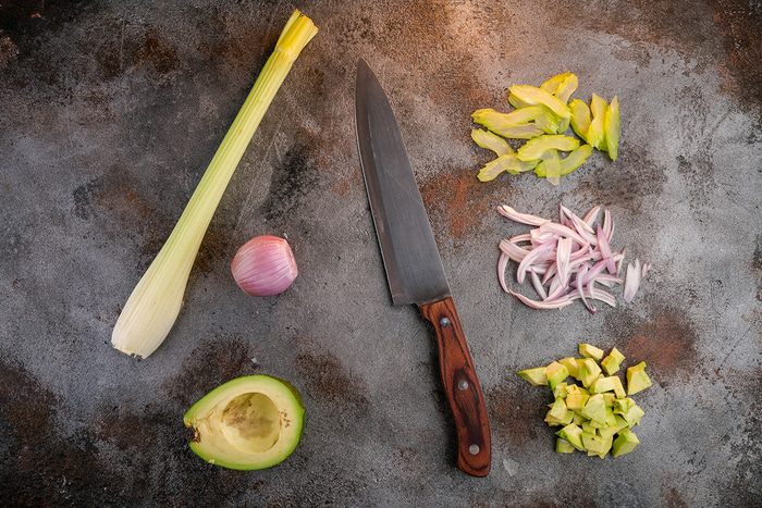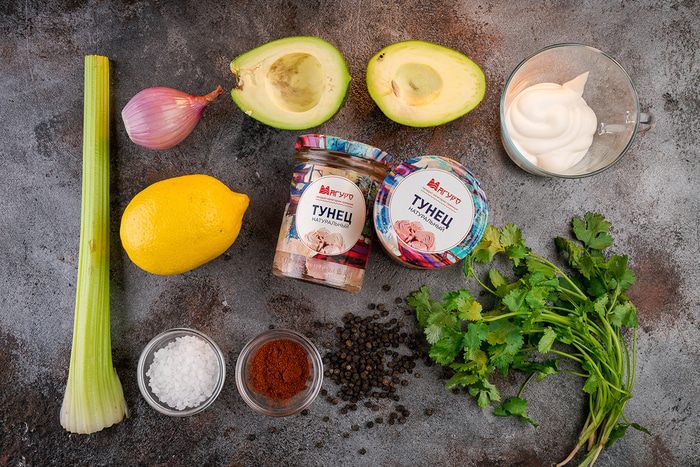 Авокадо разрезать на 2 части. Очистить от мякоти, оставляя небольшую часть в кожуре. Вторую часть мелко нарезать. Также нарезать сельдерей кубиками, лук красный.