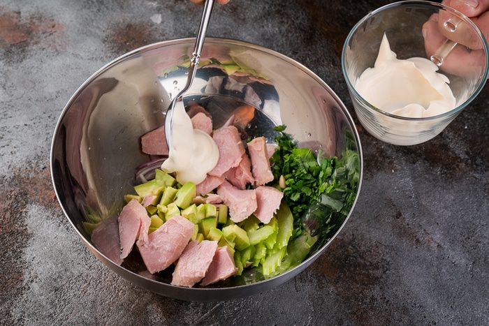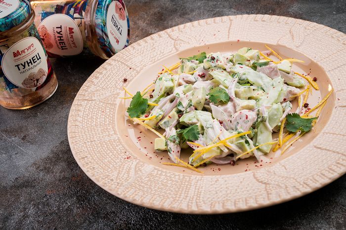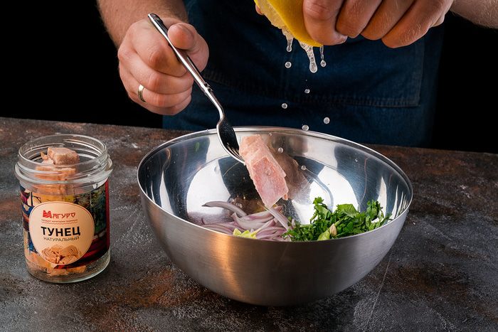 Достать тунец из упаковки и вилкой поломать. Все перемешать.