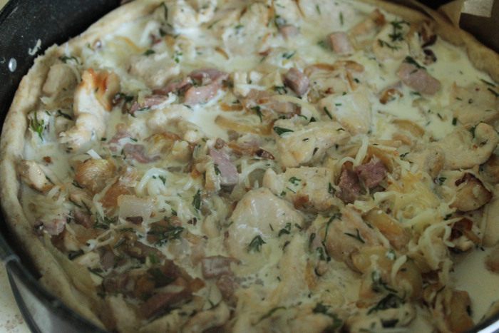 Для заливки венчиком смешать все ингредиенты и вылить ее поверх начинки.
