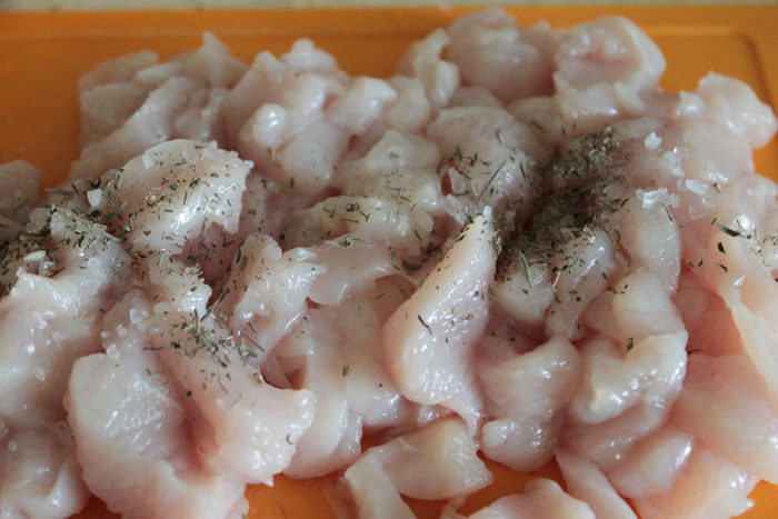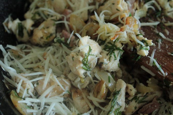 В этой же сковороде обжарить кусочки курицы, приправить ее щепоткой соли, перцем и тимьяном. Далее на этой же сковороде обжарить репчатый лук до зарумянивания. Смешать все ингредиенты начинки.