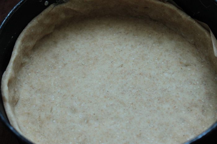Готовое тесто раскатать толщиной 5 мм, выложить тесто в форму диаметром 20 см и поставить в холодильник на 30 мин.