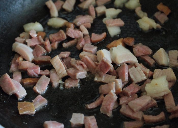Обжарить на горчичном масле Biolio бекон до зарумянивания, выложить его на бумажное полотенце.